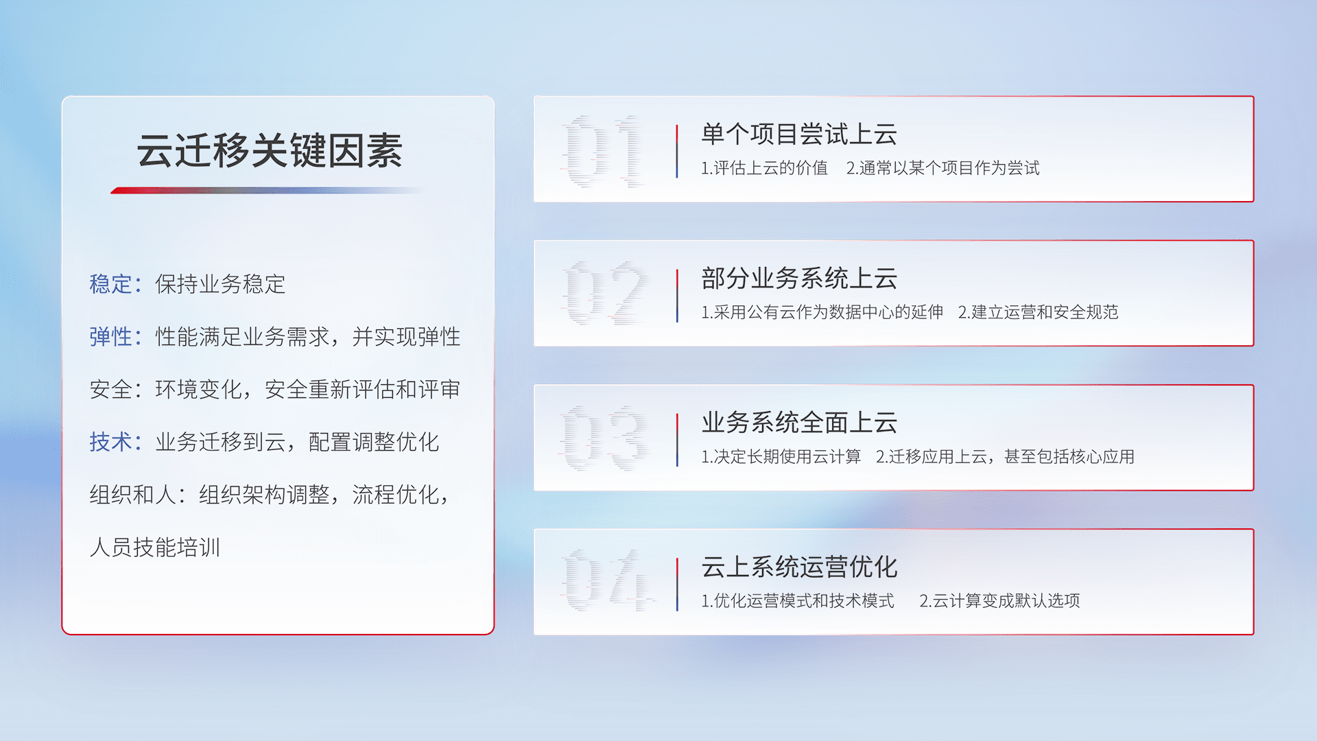 结合实际业务,,,从规划设计、、云平台选型、、云原生改造、、数据迁移、、集成交付,,,迁移全过程为客户识别最佳上云路径,,,做好风险识别管理,,,,设计网络架构、、身份权限、、安全审计合规、、、操作审计、、日志审计、、、、监控告警策略、、、多站点容灾设计等,,,,对云上基础设施进行整体规划,,,提升IT治理水平,,,以满足弹性、、、、高可用、、、、高性能的需求。。