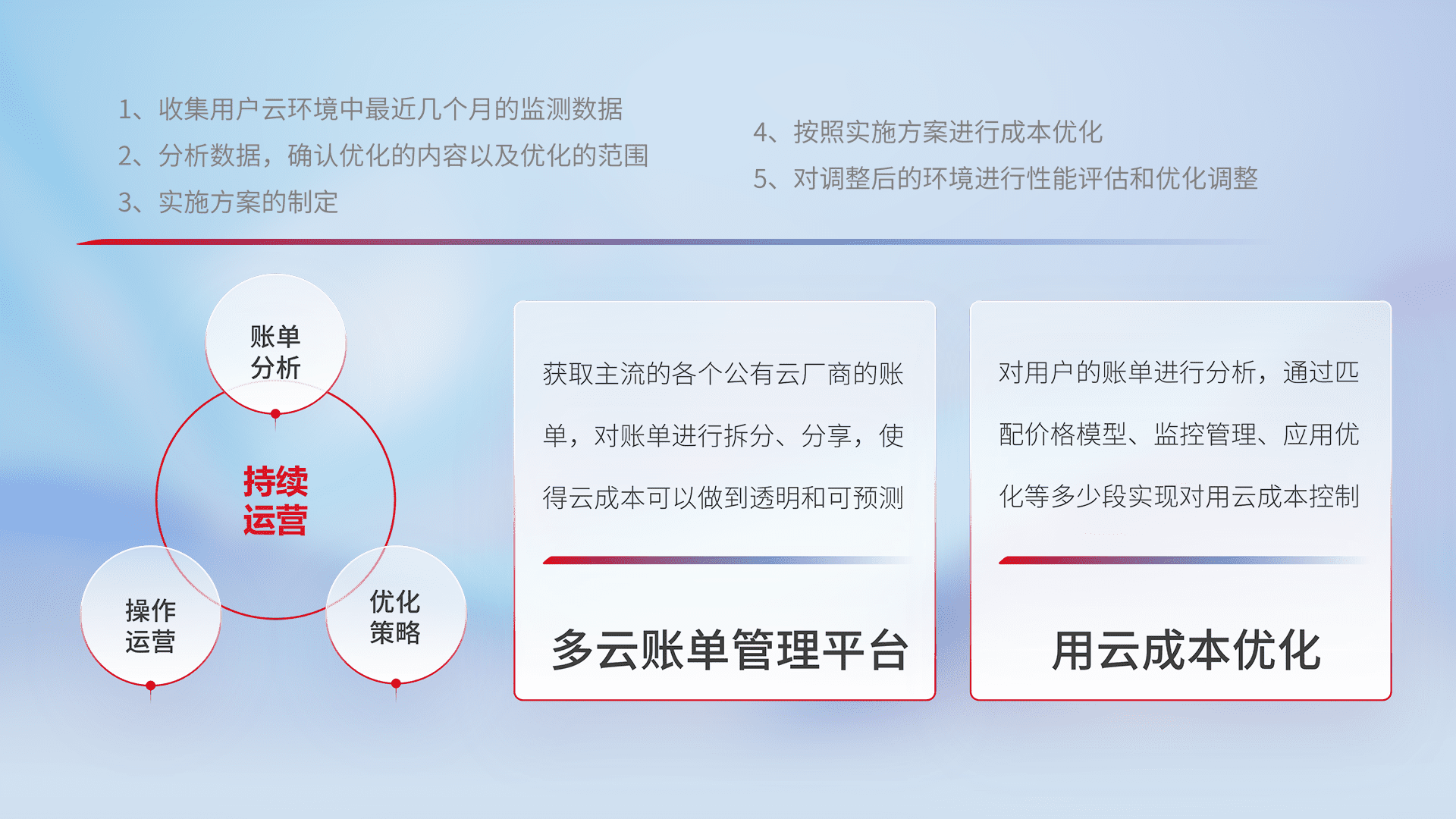 通过多云纳管,,,以统一的资源数据模型把客户的云资源进行抽象和封装,,,,进而实现对多云资源的统一操作,,保障云资源管理的可靠性、、稳定性与可用性。。。。量身定制化运维内容,,配置、、开发运维、、、补丁管理、、、备份、、、、监控、、、、认证和访问管理、、、审计和日常巡检等,,保障在用云过程中的可靠度,,,稳定度以及高可用率。。。。
