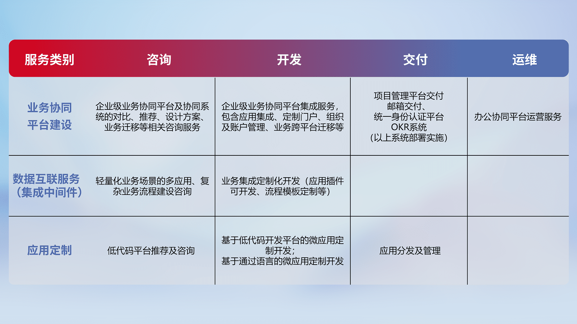 针对钉钉、、、企微、、、、IDaas等平台级产品提供产品的规划、、方案、、、、交付、、、定制化开发等服务,,,实现如统一协同办公、、、、智能客户服务、、混合会议管理、、、智能数据查询、、、等业务场景,,,实现数字化转型。。